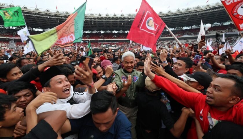 JAKARTA – Ganjar Pranowo berorasi di hadapan ratusan ribu pendukungnya di acara kampanye akbar bertajuk “Hajatan Rakyat” di Stadion Gelora Bung Karno (GBK) Jakarta, Sabtu (3/2/2024).