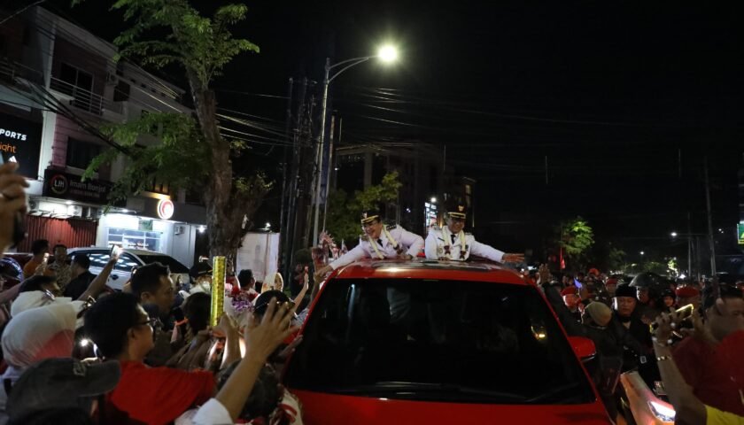 Setibanya di halaman Balai Kota, Agustina-Iswar disambut ribuan masyarakat Kota Semarang yang telah menunggu sejak sore hari.