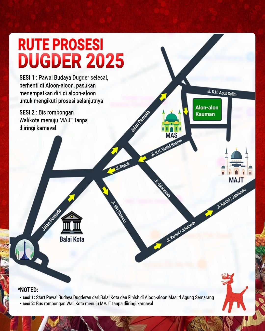 Secara detil, rute Kirab Budaya Dugderan 2025 ini bermula dari Balai Kota melewati Jalan Pemuda menuju Alun-Alun Kauman, selanjutnya arak-arakan menuju MAJT.