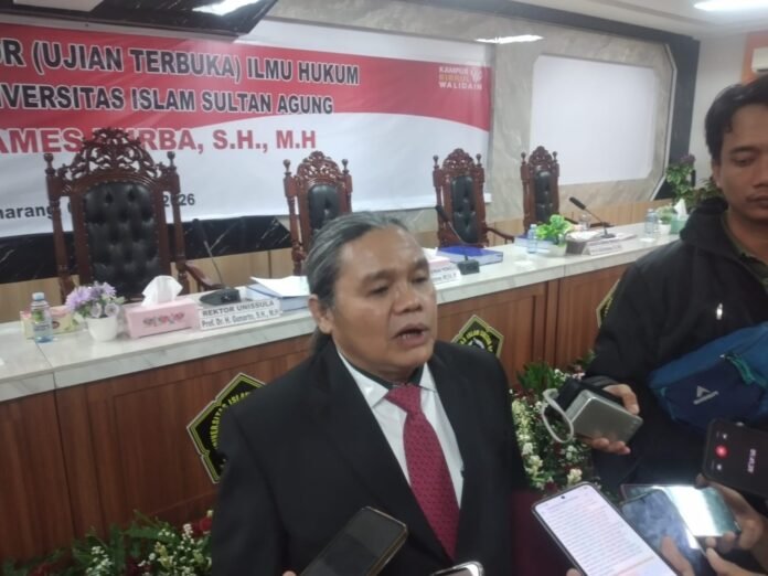 SEMARANG – Jamaslin James Purba resmi meraih gelar Doktor Ilmu Hukum setelah menjalani Ujian Promosi Doktor (Ujian Terbuka) di Fakultas Hukum Universitas Islam Sultan Agung (Unissula) Semarang, Sabtu 7 Februari 2026.