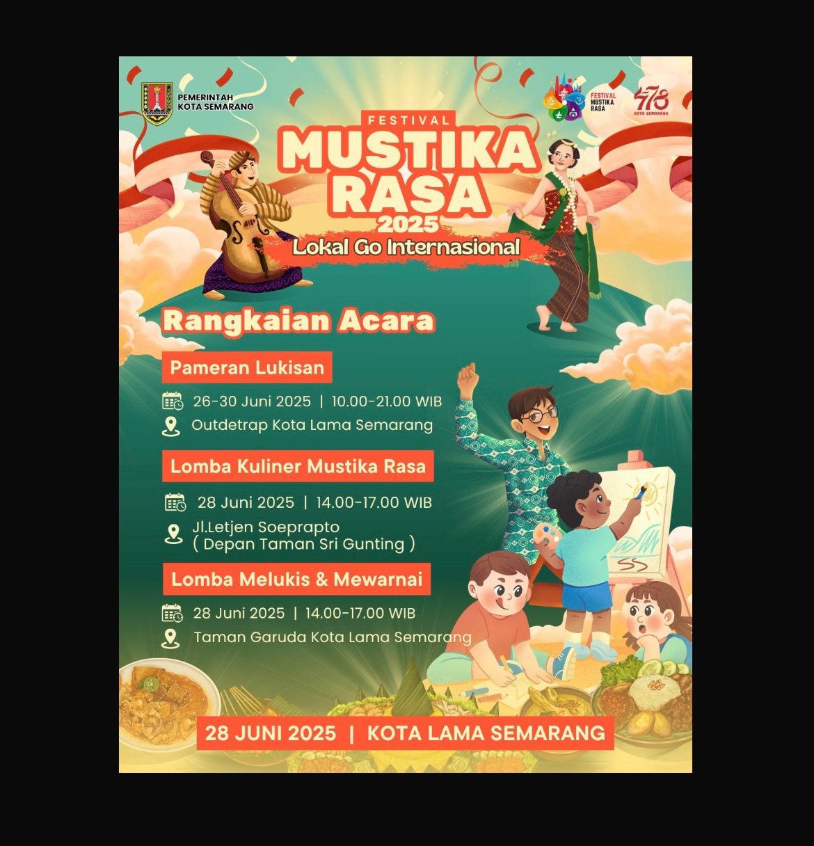 SEMARANG (lensasemarang.com) – Memperingati Bulan Bung Karno, Kota Semarang kembali menghadirkan agenda seni dan budaya yang sarat makna melalui Gelaran Festival Mustika Rasa. Acara kreatif ini akan berlangsung mulai tanggal 26–30 Juni 2025 di kawasan Kota Lama Semarang, dengan puncak kegiatan pada Sabtu (28/6/2025). Festival ini diharapkan bisa menghidupkan semangat nasionalisme dan menguatkan kecintaan masyarakat terhadap budaya Indonesia. Berbagai kegiatan dengan format yang segar akan digelar, seperti Pameran Lukisan, Lomba Menggambar dan Mewarnai, serta Lomba Kuliner Mustika Rasa yang diangkat dari buku resep legendaris peninggalan Bung Karno, “Mustika Rasa”. Acara…